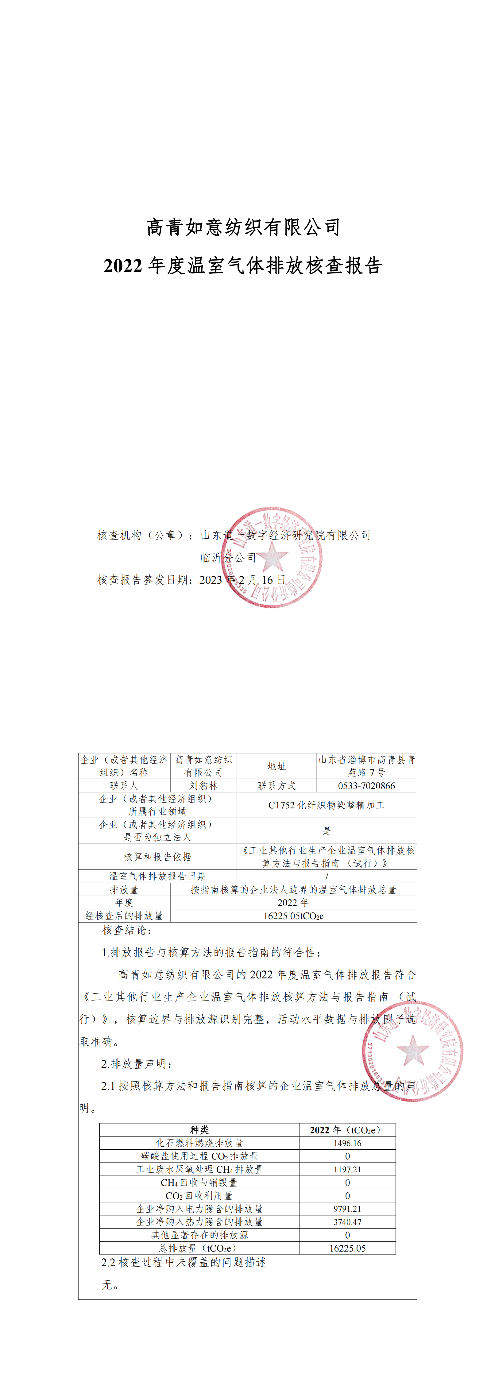 高青如意纺织有限公司 2022年度温室气体排放核查报告